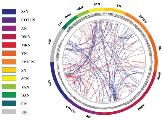 In Figure 4, the 13 RSNs are mainly concerned with the perception of movement, memory, language and other several functions of brain, and they are the sensory/somatomotor network (SSN), cingulo-opercular task control network (COTCN), auditory network (AN), default mode network (DMN), memory retrieval network (MRN), visual network (VN), fronto-parietal task control network (FPTCN), salience network (SN), subcortical network (SCN), ventral attention network (VAN), dorsal attention network (DAN), and cerebellar network (CN), respectively. In which, SSN contains the precuneus, cingulate gyrus, precentral and postcentral gyrus, superior frontal gyrus, and some other brain regions. COTCN contains the middle frontal gyrus, insula, superior temporal gyrus, etc. In DMN, the main brain regions include the posterior cingulate, medial frontal gyrus, parahippocampal gyrus, bilateral lateral temporal lobe. VN mainly contains the middle and inferior occipital gyrus, lingual gyrus and cuneus. FPTCN includes the superior parietal lobule and frontal gyrus. The main regions in SCN are the extra-nuclear, lentiform nucleus and thalamus. VAN is composed of the superior and middle temporal gyrus, inferior frontal gyrus and inferior parietal lobule. Among the 264 ROIs, there exist 28 ROIs with which the functional roles are uncertain, and they are uniformly merged into the uncertain RSN [35].