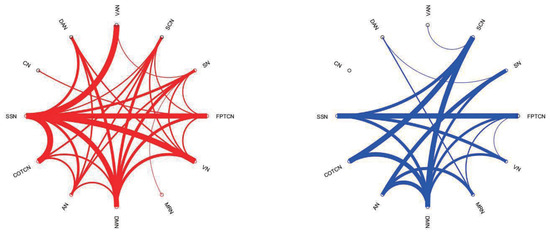In addition, the distributions of the 104 functional connections among the 12 certain RSNs are illustrated in Figure 6, where the thickness of the line represents the number of different function connections, i.e., the thicker the line is, the stronger functional connection is. Furthermore, the enhanced and weakened functional connections are shown in Figure 7 by the BrainNet Viewer toolbox [52].