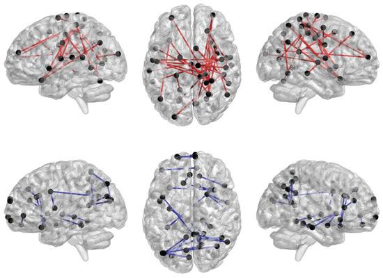 The significant differences of functional connectivity on regions of interest (ROIs) between young adults and children, where the red lines represent those strengthened functional connections in the brains of young adults relative to children, and the blue lines represent the weakened functional connections.