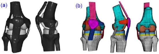 (a) 3D geometric anatomical model of knee joint after TKA; (b) finite element model of knee joint after TKA.
