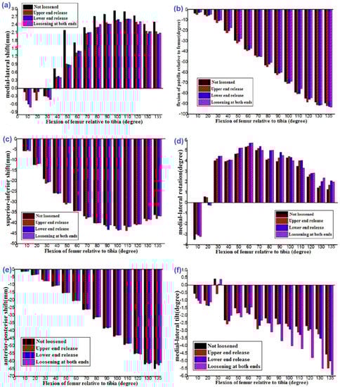 The four different knee joint finite element models were imported into the finite element analysis ABAQUS software, version 6.10 (Dassault SIMULIA Corp., Paris, France). Within 0–135 degrees, the data of motion characteristics at different flexion degrees were calculated and analyzed, as shown in Figure 5.