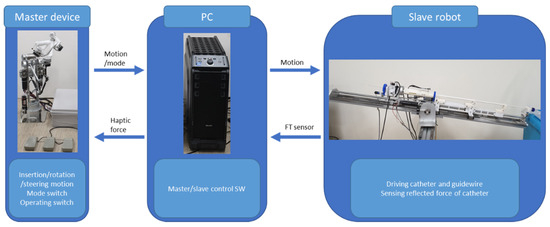 The master device and the slave robot are controlled through a single personal computer (PC). The PC obtains motion information and mode information from the master device and sends an operation command to the slave robot. The slave robot drives the catheter and the guidewire according to the motion information from the master device. The FT sensor mounted on the slave robot measures the repulsive force generated by the blood-vessel wall while the catheter is being inserted, and the PC sends a haptic command to the master device according to the measured FT sensor value. A block diagram of the master–slave system is shown in Figure 9.