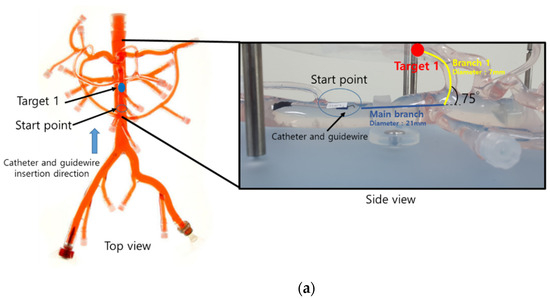 We compared the performance of the existing curved catheter and the developed steerable catheter (Figure 10) for the vascular interventional robotic system. The effectiveness of the haptic function was experimentally tested. The phantom employed in this experiment was manufactured by United Biologics [23]. It was designed to include vascular lines of the abdominal region. The experiment comprised three scenarios, as shown in Table 1. Each scenario targeted three points of the vascular phantom. Figure 11 presents details regarding the three targets and their paths. The path to the first target was smooth compared with those to the other targets. The third target was the most difficult to reach, as the path was highly curved. The operator controlled the slave robot by using the master device with visual feedback from top-view and side-view cameras. For each scenario, the time taken to reach the target and the repulsive force measured during the insertion of the catheters were measured. The experiment was repeated 10 times for each target to obtain average data.