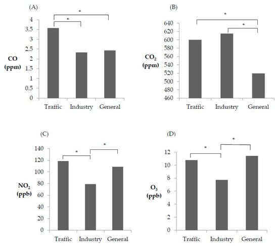 The 24-h average concentration of indoor air pollutants (A) CO, (B) CO2, (C) NO2, and (D) O3 in the houses of traffic, industry, and general areas. * Scheffe test p < 0.01.