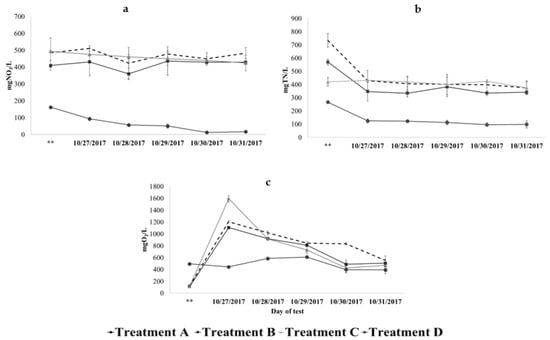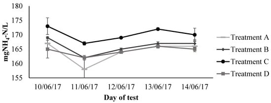 ) measurements showed great variability. In the case of NO3−-N, the variation amongst the measurements could be attributed to the different analytical methods used. The test kits were used to determine TN, whereas, NO3−-N and NH4+-N were determined by ion chromatography. The high dilution factors were needed to analyse the samples by ion chromatography due to high sensitivity and low detection limits of the equipment. Considering that this fact could have increased the error or variation in the analysis, the results were corroborated and some samples re-analysed using quick test kits. The inconsistent NO3−-N values evidenced through the comparison with the TN concentration, and after testing similar methodologies, were considered as outliers and removed from the dataset. The overall tendency indicates that NO3−-N concentrations decreased only in treatment D from 341 mg/L to 223 mg/L, indicating a removal of 35%. The estimated effects of this treatment supported that nitrate concentrations significantly decreased (p < 0.05) in the non-aerated container. The ammonium concentrations started to decrease significantly after a one-week period of the second stage of the experiment (Figure 5