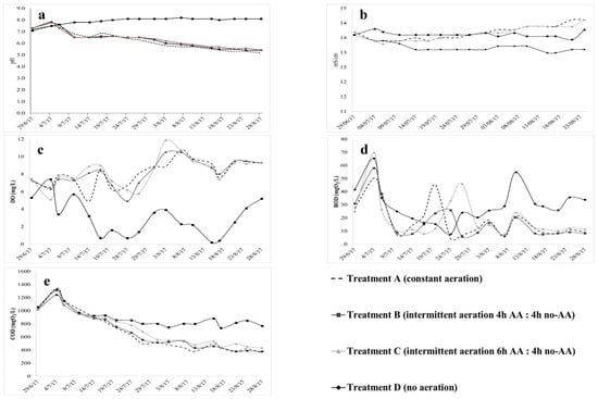 Evolution of (a) pH, (b) conductivity, (c) dissolved oxygen, (d) biological oxygen demand, (e) chemical oxygen demand in each IBC exposed to different aeration periods. Treatment A (constant aeration), Treatment B (intermittent aeration 4h AA:4h no-AA), Treatment C (intermittent aeration 6h AA:4h no-AA), Treatment D (no aeration), AA = aeration.