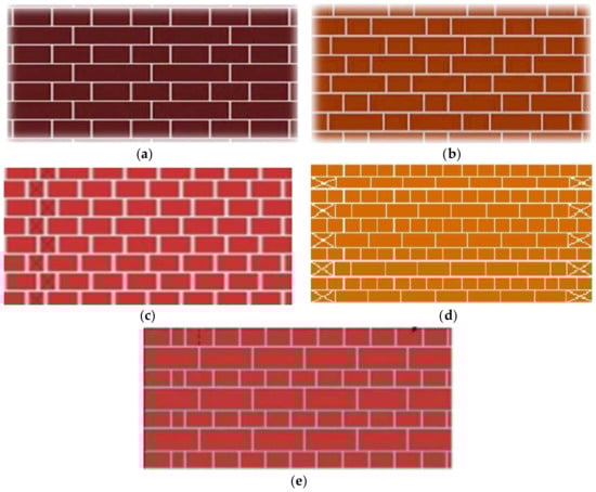 Types of masonry bonds [,]: (a) English bond; (b) Flemish bond; (c) header bond; (d) Dutch bond; (e) silver-lock bond. Note: Changes in colour do not represent any change in brick type and are only to distinguish between bond figures.
