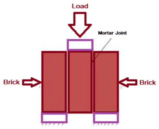 The in situ shear test (ASTM C 1531–03) [] and the triplet shear test (Rilem TC 127-MS.B.4) [] were designed as a mechanism for independent lab testing, as shown in Figure 3. The in situ shear tests were performed without level jacks, and the triplet shear tests were performed with various levels of focus-point pre-weight stacks []. Figure 3 shows a triplet combination of three bricks which are connect with the mortars of different mix ratio combinations. Load is exerted on the middle brick with the help of compression machine to check the bond triplet based strength []. The commitment of the neck range joints was not considered in the bed-joint shear quality estimation, as the neck region joints were by and large deficiently laid, and therefore their devotion to the bed-joint shear quality was immaterial [].