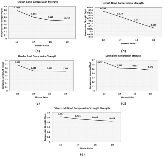 Compressive strength for the (a) English bond; (b) Flemish bond; (c) header bond; (d) Dutch bond; and (e) silver-lock bond.