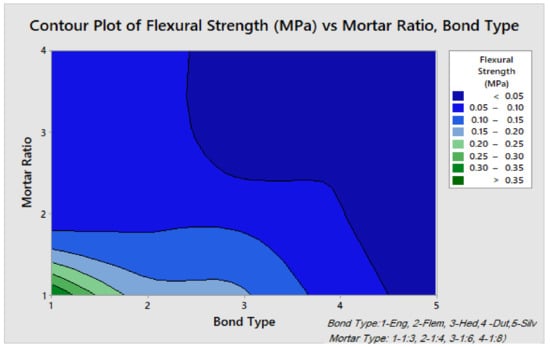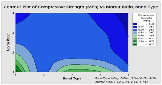 The connection between the block and the mortar is crucial for composite conduct between the two materials. Advancement of the side pressure leads to pressure in the block and cement or the other way around, keeping in mind the presumption that there is no connection weakness at the interface. It is valuable to comprehend the relationship between the bonds and the compressive quality []. As demonstrated, the block utilized here with an English bond had a higher value of compressive strength (0.786 MPa) in comparison to any other bond. The brick would be triaxle pressure, while the mortar would be biaxial strain and pressure. The level-pressure brick was the aftereffect of stiffer mortar pulling internally at the similarity of the strain. The shear stress of the block mortar interface prompted flat pressure in the block. Because the association with the block mortar interface broke, the flat pressure-actuated shear push additionally vanished, and the block fizzled through horizontal strain. A contour graph shows the higher-strength area clearly. A block-wise comparative assessment can be seen in Figure 6 and Figure 7.
