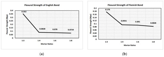 In this study, compressive and flexural strength were determined by preparing five types of brick bonds with four cement mortar ratios. After application of the bond mechanism, its combinations were tested with changes in the mortar ratio. The results showed that the English bond was at a maximum (0.786 MPa) with a mortar ratio 1:3 and was at a minimum (0.492 MPa) with a mortar ratio of 1:8; the Flemish bond was at a maximum (0.538 MPa) with a mortar ratio of 1:3 and was at a minimum (0.507 MPa) with a mortar ratio of 1:8; the header bond was at a maximum (0.683 MPa) with a mortar ratio of 1:3 and was at a minimum (0.518 MPa) with a mortar ratio of 1:8; the Dutch bond was at a maximum (0.652 MPa) with a mortar ratio of 1:3 and was at a minimum (0.476 MPa) with a mortar ratio of 1:8; and the silver-lock bond was at a maximum (0.517 MPa) with a mortar ratio of 1:3 and was at a minimum (0.424 MPa) with a mortar ratio of 1:8. Overall, the English bond with a maximum of 0.786 MPa with a mortar ratio of 1:3 was the best combination. The results are shown in Table 6.