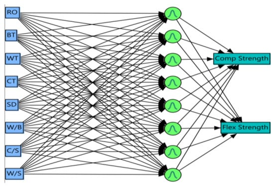 Artificial neural networks (ANN) are propelled in the way shown in Figure 10. An artificial neural network (ANN) technique was deployed to analyse the strength behaviour of the different brick bond combinations and mortar ratios. Compressive strength (MPa) and flexural strength (MPa) are two major parameters known as decision-making indicators for the strength of a structure. These two variables were predicted in terms of cement, sand, water, the mortar ratio, the bond type, the cement/sand ratio, the water/binder ratio and the water/sand ratio. A relationship analysis of compressive and flexural strength and these variables provided a significant combination relation analysis. The data description for this study is shown in Table 8.