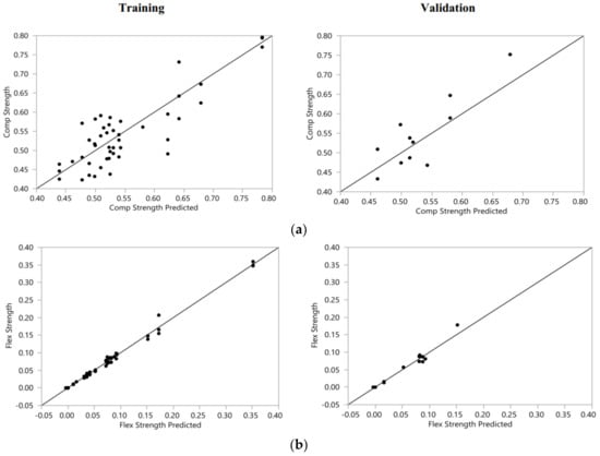 The accuracy of prediction could be visualized in plots drawn for compressive and flexural strength (between actual and predicted data for both the training and validation data), as shown in Figure 11.