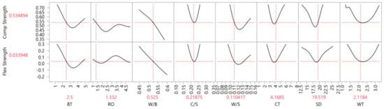 Prediction profiles for compressive and flexural strength with respect to factors.