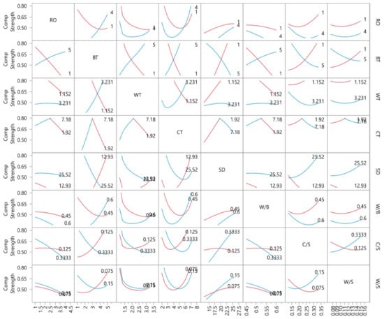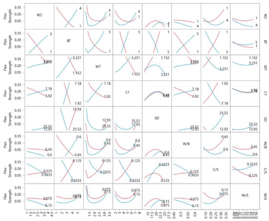Prediction profiles provided an opportunity to identify and estimate the behaviour of different variables in compressive and flexural strength, as shown in Figure 12. With an increase in the cement and sand quantity, there was an increase in strength properties, but with an increase in water strength, those properties were reduced. The cement/sand ratio also gave a significant increase in strength. Water in terms of the binder showed a decrease in the strength ratio. A mortar mix ratio of 1:3 showed the highest strength in terms of the other mix ratios.