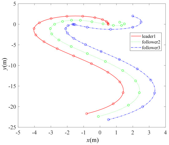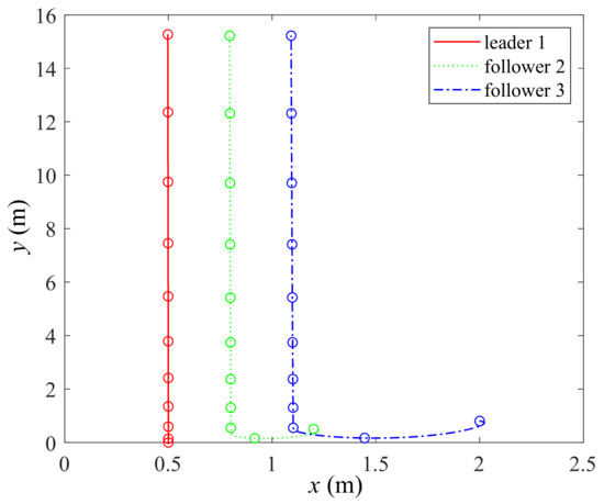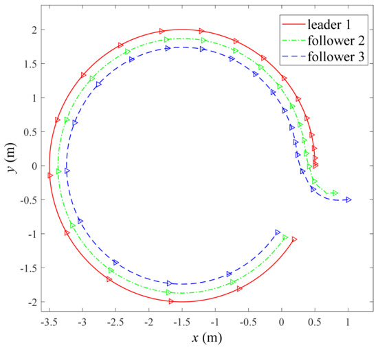 This platform in Figure 10 forms up a string when moving along a straight trajectory. Both the adaptive law and the controller parameters were kept unchanged. The state variables and the control inputs are not illustrated because they are similar to Figure 3. The initial postures of the three robots are set by