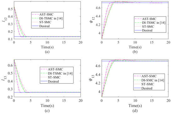 Figure 4 demonstrates the state variables in (8) when the multi-robot system fulfills the formation task in Figure 3. For the purpose of comparisons, the other three classic control methods were also implemented on the same platform to accomplish the same formation task besides the presented control method (short for AST-SMC in Figure 4). These control methods are listed as the derivative-integral terminal sliding mode control [14] (short for DI-TSMC in Figure 4) and the sole super-twisting sliding mode control without any adaptive gains (short for ST-SMC in Figure 4).