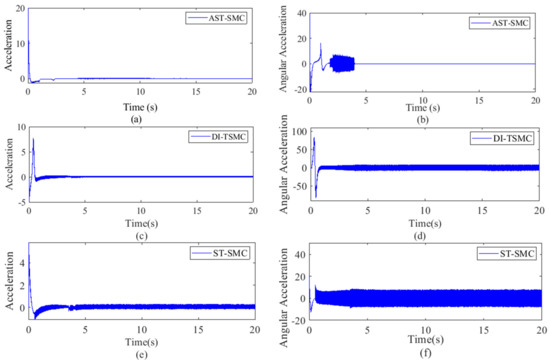 Comparisons of the control inputs from the follower 3. (a) Acceleration by AST-SMC, (b) angular acceleration by AST-SMC, (c) acceleration by DI-TSMC, (d) angular acceleration by DI-TSMC, (e) acceleration by ST-SMC, (f) angular acceleration by ST-SMC.