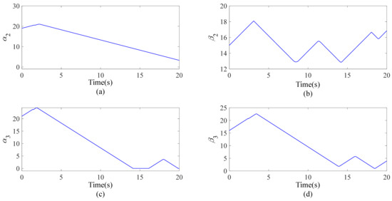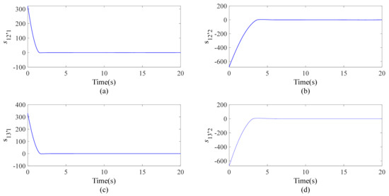 Figure 7 illustrate the sliding surfaces of the adaptive-gain super-twisting sliding mode control method. The gains , , , and governed by the designed adaptive law (24) are demonstrated in Figure 8. As proven in Theorem 1, the sliding surfaces are convergent in infinite time although the time instants cannot be known in advance. Further, the curves of the gains in Figure 8 are not convergent. In fact, they are bounded as proven in Theorem 1.