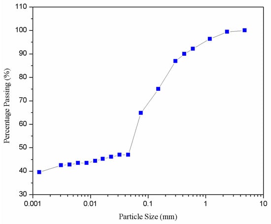 Residual soil samples used in the current study were collected from a construction site at Bukit Tunku, Kuala Lumpur, Malaysia. The construction site lies around longitudinal 3°10′13.1″ N and latitude 101°41′10.5″ E that is underlain by Kenny Hill Formation, which comprises of phyllite, quartzite, and schist with a minor intercalation of limestone []. A shovel was used to excavate the soil sample from a depth of 0.5 m below the ground surface. Then, the collected samples were bagged and transported to the laboratory for investigation. The particle size distribution of the obtained soil samples is shown in Figure 1. As shown in Figure 1, the obtained soil samples were dominated by 64.8% of fine fractions (25.3% of silt and 39.5% of clay), 34.63% of sand, and 0.57% of gravel.