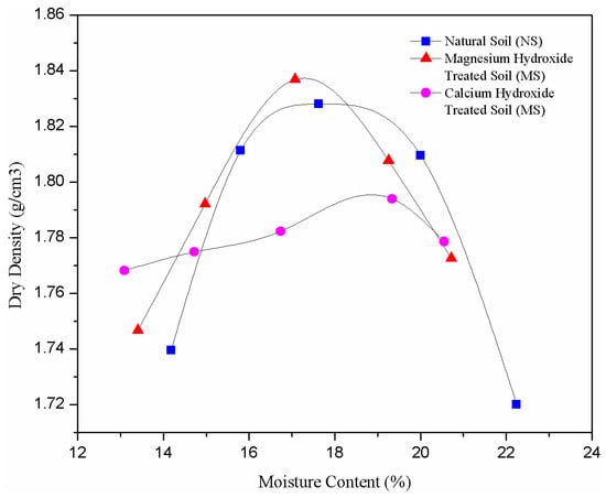 The compaction characteristics of untreated and nanoparticles-treated residual soils are shown in Figure 2. The maximum dry density (MDD) recorded for natural soil (NS) was 1.828 kg/m3. With the presence of magnesium hydroxide nanoparticles, the MDD increased to 1.837 kg/m3. However, the MDD decreased to 1.794 kg/m3 for soil samples treated with calcium hydroxide nanoparticles. The optimum moisture content (OMC) of NS had a value of 18%, and upon treatment with calcium and magnesium hydroxide nanoparticles, the OMC of the treated soils reduced to 17.1% and increased to 19.3%, respectively. This observation shows that the presence of magnesium and calcium hydroxide nanoparticles have different impacts on the compaction characteristics of residual soils. The increment in MDD and reduction in OMC of magnesium hydroxide nanoparticles-treated soil (MS) can be related to the decreased thickness of DDL around the soil particles due to the presence of divalent magnesium cations. The reduced thickness of DDL led to lower attraction of water molecules; thus, this contributes to the reduction in the OMC and increment in MDD of MS. The compaction characteristics of calcium hydroxide treated residual soils (CS) exhibited a different trend whereby their MDD decreased accompanied by increased OMC. Similar trends were reported by [,] that adopted calcium-based additives in the stabilization of residual soils. It is quite likely that the pozzolanic reactions between the soil and calcium ions led to a higher accumulation of water molecules around the soil particles []. This situation resulted in an increased OMC of CS, causing large water films developed around the soil particles. The presence of large water films prevents the closer packing of soil particles and reduces their MDD as observed.