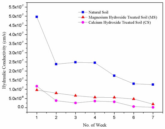 Figure 3 displays the relationship between hydraulic conductivity over permeation time for untreated and nanoparticles-treated soil samples. It is observed that the hydraulic conductivity of untreated and treated samples decreased with testing duration. The hydraulic conductivity of NS decreased from 4.96 × 10−7 cm/s to 1.26 × 10−7 cm/s after seven weeks of testing. It is quite likely that after long-term permeation, the voids between the soil particles are fully occupied by the water molecules. As a result, the movement of water along the compacted soil samples slows down and reduces the hydraulic conductivity of NS. The hydraulic conductivity of nanoparticles-blended soil reduced to almost one order of magnitude after seven weeks of permeation. The percentage reduction of the hydraulic conductivity values after seven weeks of permeation for the magnesium and calcium hydroxide nanoparticles-treated samples relative to the first week were approximately 81% and 99%, respectively. The observed percentage reduction in the hydraulic conductivity of nanoparticles-treated soils was more significant than that of untreated soil (75%). This variation can be due to the clogging of soil pores by the formation of cementing gels from the reactions between magnesium and calcium nanoparticles and the soil matrix. Among the two nanoparticles-treated samples, CS showed better hydraulic performance compared to MS, as evident by their percentage reductions. This phenomenon can be attributed to the effectiveness of the cementing gels formed for the CS relative to the MS. Likewise, the higher OMC of CS compared to MS provides a more convoluted flow path for water to follow. Consequently, a further decrease in the hydraulic conductivity was observed. It is interesting to note that the recorded hydraulic conductivity values for the treated soil specimens satisfied the permeability requirements for landfill liner materials (≤1 × 10−7 cm/s) specified by [,,].
