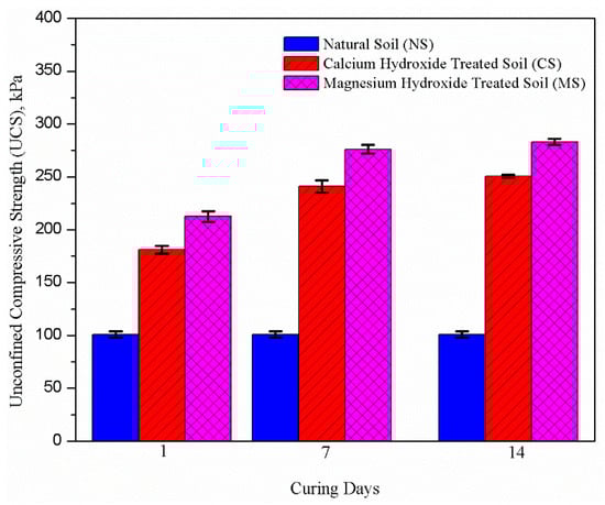 The variation of the UCS for the untreated and treated soil specimens after one, seven, and 14 days of curing are demonstrated in Figure 4. It is observed that the UCS for the treated soils were significantly greater than that of the untreated soil at the various curing duration. It is also noted that the treated soil samples experienced a gain in strength with increasing curing duration. The improvement in the strength of MS and CS at a shorter curing period is associated with the flocculation/agglomeration of soil particles due to the cation exchange process that led to reduced DDL thickness. The flocculation of soil particles increases the effective grain size, and thus increases the contact between the soil particles, and hence resulted in the enhanced strength of the compacted soil. At a longer curing period, the increase in the UCS can be attributed to the formation of cementing gels, including magnesium silicate hydrate (M-S-H), magnesium aluminate hydrate (M-A-H), calcium silicate hydrate (C-S-H), and calcium aluminate hydrate (C-A-H) due to the nanoparticles–soil interaction, which improved the bonding of the soil particles, and consequently increased the UCS of the treated soil []. Likewise, the nanoparticles turn to fill the voids of the soils effectively; hence, decreasing the porosity and increasing the particle–particle contact. Consequently, a further increase in the UCS was observed for the treated specimens. It is also observed that the strength improvement of CS was superior to that of MS samples at various curing durations. This strength variation is associated to the smaller hydrated radius of Ca2+ compared to Mg2+ (0.412 nm for Ca2+ versus 0.428 nm for Mg2+) [], leading to stronger electrostatic attraction between Ca2+ and the negatively charged clay. It is reported that a smaller hydrated radius will have weaker hydration capability due to its lower affinity to the water molecules; hence, contributing to the higher retention of the Ca2+ on the clay surface []. This phenomenon inevitably triggers the higher rate of formation of cementing gels, particularly C-S-H and C-A-H, causing the superior performance of CS compared to MS. In fact, the UCS of MS (241 kPa) and CS (276 kPa) after 7 days of curing were superior to the UCS reported by [,] that performed investigations on the residual soils treated with (i) potassium hydroxide and untreated coir fibers (170 kPa), (ii) potassium hydroxide and treated coir fibers (230 kPa), and (iii) rice husk ash (150 kPa) at the same curing period.