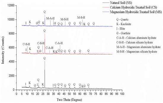 The XRD micrographs for untreated and treated soil samples after 14 days of curing are illustrated in Figure 5. The main minerals identified in the natural and treated soil samples at various 2θ angles are quartz, kaolinite and illite. A minor reflection of goethite was also observed. Although no major changes occurred in the diffractograms of the treated soil in comparison to the natural soil, the apparent appearance of several new reflections for the treated soil were observed. These reflections are associated with the formation of cementing gels, including calcium silicate hydrate, calcium aluminate hydrate, magnesium silicate hydrate, and magnesium aluminate hydrate due to the reactions of the calcium and magnesium ions with the silicates and aluminates at the soil surface, as shown in Equations (4)–(7) [].