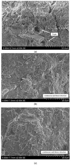 Figure 6 presents the VP-SEM images for the untreated and treated soil samples after 14 days of curing. It is noticed that the natural soil samples (Figure 6a) showed a dispersed structure with a considerable number of visible voids. At the same magnification scale, both calcium and magnesium hydroxide treated soil samples (Figure 6b,c, respectively) exhibited a continuous and dense structure. This observation provides evidence for the improved UCS and reduced hydraulic conductivity of the treated soil samples as the combined effects of flocculation and the formation of cementing gels such as calcium silicate hydrate, calcium aluminate hydrate, magnesium silicate hydrate, and magnesium aluminate hydrate enhanced the interlocking of soil particles and resulted in a denser soil structure. In addition, the denser soil structure inevitably restricted the water flow path as the tortuosity of water flow path increases due to reduced soil pores. This behavior is primarily responsible for the lower hydraulic conductivity values obtained for the treated soil samples relative to the natural soil sample.