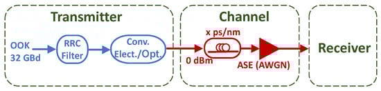 Figure 1 shows the simulation setup used to validate the proposed system. At the transmitter, the DAC is the assumed ideal and an OOK 32-GBd signal is generated with symbols, up-sampled to eight samples per symbol and filtered by a RRC filter (roll-off = 0.1). The digital signal is directly mapped onto the optical domain by assuming an ideal linear transformation. The MZM is assumed ideal in order to neglect its nonlinear transfer function as a source of degradation and to focus solely on the impact of CD. The CD (D = 16.4 ps/nm/km) is the only impairment considered in the optical fiber, and additive white Gaussian noise (AWGN) is used to simulate the pre-amplifier at the Rx point. The noise variance and fiber length (accumulated CD) are swept to meet the target SNR and distance. The signal is then detected by a DD receiver.