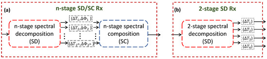 SC applies the inverse transfer function of the SD, and it is highlighted in blue dashed lines in Figure 3b. Perfect reconstruction of the signal is obtained if the SD is applied, followed directly by the SC. By knowing the transfer function of CD, a time delay and phase shift in each of the sub-bands of the SD can approach the inverse of the CD transfer function. The approximation increases in accuracy for increasingly narrower spectral slices. The values of the delay and phase depend on the number of sub-bands and the CD. The SD and SC structures, together with the delay and phase to mitigate the CD in each sub-band, is called the n-stage SD/SC Rx (Figure 4a) in this work.