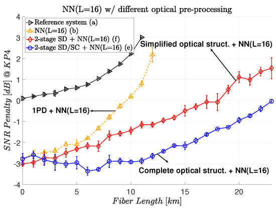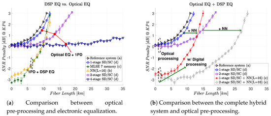 Figure 6 shows the results comparing the performance of a complete hybrid optoelectronic structure. Figure 6a compares the optical and electronic equalization, individually. The black curve (right-side triangle) shows the result without optical or digital signal processing, namely our reference system. The blue (circle), purple (square), and dark blue (upside-down triangle) curves are the ones with only optical pre-processing. We note that increasing the number of stages in the n-stage SD/SC structure increases the maximum transmission reach. As we better compensate the CD, the narrow slices are required [21]. Using four-stage SD/SC, a transmission of more than 574 ps/nm of accumulated CD (35 km of equivalent fiber) is demonstrated with less than 1 dB of SNR penalty at KP4, compared to a back-to-back transmission. The dark green (star) dashed line curve and yellow (upper triangle) dashed line curve are the digital processing for MLSE and NN, respectively. It is worth to point out that the seven-memory MLSE and the NN had similar performance. Using only electronic processing with an NN equalizer or MLSE, we showed a transmission of 164 ps/nm of accumulated CD (10 km of equivalent SSMF), considering a 0 dB SNR penalty at KP4 FEC compared to a back-to-back transmission. A difference between optical and digital performance can be clearly seen. As the phase is not accessible in the digital domain after the PD, such a difference appears [8].