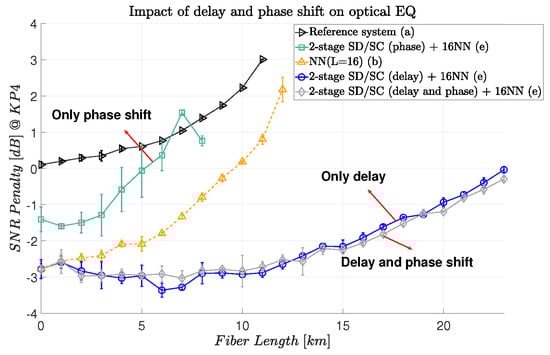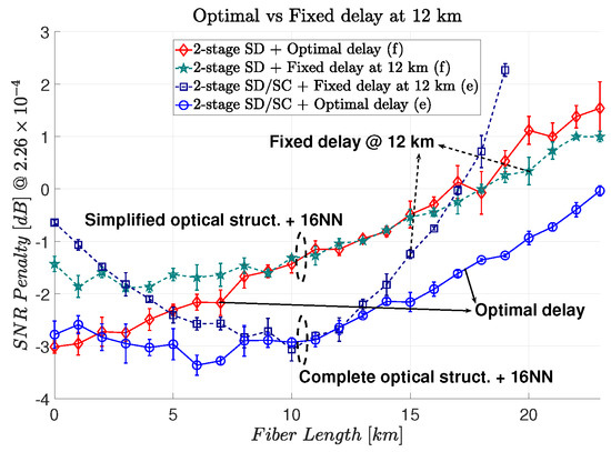 Considering only the hybrid two-stage SD, there was no penalty for the distance from 7 to 18 km. Below 7 km, the performance with a fixed delay was higher, which could indicate a missing interpolation operation from the NN to adapt to a better time delay. For distances from 18 to 23 km, we note that the fixed delay had less penalty. However, the curve with optimal delay showed a higher standard deviation, which indicates a more difficult convergence for the trainable variables. Fixing the delay would mean simplifying the convergence for the NN and, for this specific amount of CD, it showed better performance. Considering the hybrid two-stage SD/SC, we note that there was no penalty from 8 to 13 km. Outside this range, the penalty increased faster compared to the optimal delay.
