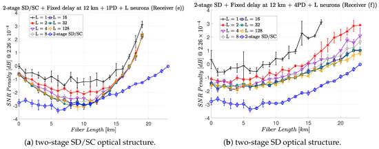 Figure 8 shows a comparison between the two-stage SD/SC and two-stage SD optical modules in a hybrid topology with an NN (L = 16). Without the SC structure, a two-stage SD module still mitigates the CD with ≈1.5 dB of the SNR penalty at KP4 FEC. We can also note that in the back-to-back transmission, there is almost no SNR penalty, which indicates that the NN is being able to regroup the four signals back into a single one.