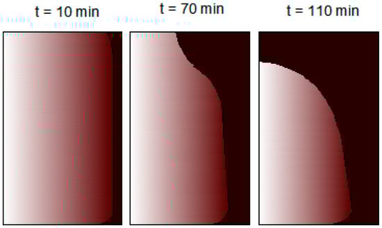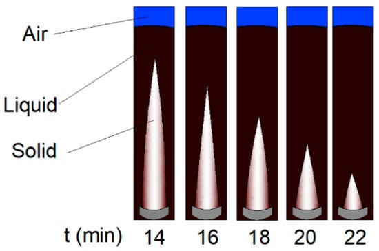 In the melting process, heat conduction is dominant only in the initial stages [58]. In any case, convective heat transfer influences most of the melting process [60], as can be detected in the morphology of the solid phase. Regarding rectangular cavities with heat transfer in one side, the liquid phase close to the hot wall flows upwards due to buoyancy forces induced by density reduction in the function of temperature increase. The convective motions heated by the hot wall cause a higher melting rate in the upper region, as the solid assumes a tapered shape that becomes more evident over time, as shown in Figure 3 about experimental results outlined in work [61].