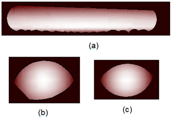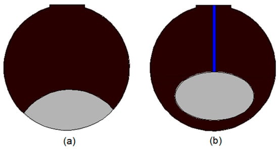 Regarding the case with the fixed solid, the wavy profile in the lower portion of the solid is visible both longitudinally (Figure 6a) and transversally (Figure 6b). The case of close contact melting (Figure 6c) does not show the wavy profile, but the solid keeps the shape more symmetrical and similar to the cavity shape. The melting process in spherical containers presents solid shapes like the transversal view of the horizontal cylinder, as depicted in Figure 7, deducted from work [58].