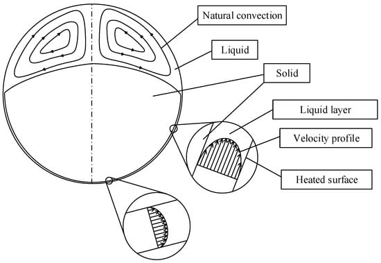 Based on pure observation, both close contact melting (Figure 7a) and fixed solid melting (Figure 7b) show similar solid shapes of the transversal view detected in the case of a horizontal cylinder (Figure 6c,b, respectively). Another common characteristic of close contact melting is the higher melting rate for the same geometry and same thermal condition when compared with unconstrained melting. During the close contact melting process, the solid keeps moving towards the heated surface while the liquid layer thickness is stable. This condition provides a nearly constant liquid flow upwards and consequently a nearly constant melting rate, as outlined in work [63]. The liquid layer thickness increases due to the reduction of the body forces from the solid portion, as the solid mass reduces over time [65] at the end of the process. Visualization of the liquid layer below the solid is very difficult to be observed, due to its very small thickness [63,64]. Most of the PCM melted in the entire close contact melting process comes from this liquid layer between the solid and the lower surface. However, some authors have detected a contribution of about 10–15% from natural convection in the upper region for both spheres [64] and horizontal cylinders [67]. Figure 8 shows, schematically, the liquid flow during the close contact melting inside a sphere, where it is possible to observe the liquid streams of natural convection in the upper region and the liquid layer between the solid and the lower heated surface.