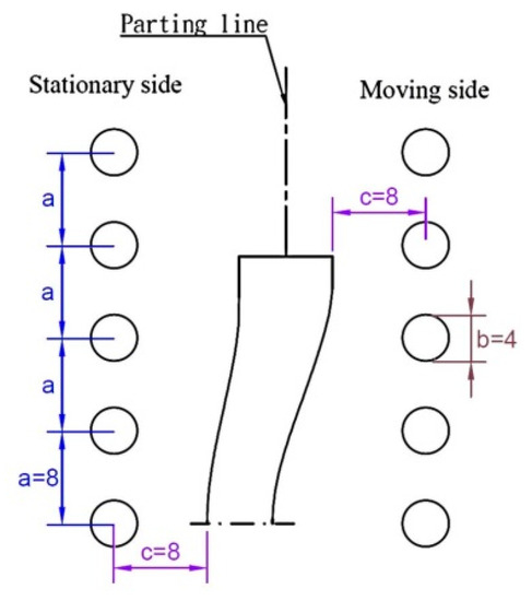 The core and cavity plates used in this study were made of NAK80, which is prehardened steel. The dimensions of the mold were 150 mm (L) × 150 mm (W) × 205 mm (H). A single-cavity mold containing both conventional cooling channels and planar conformal cooling channels was adopted (Figure 3) because the lens was large. The total number of elements in the cavity was 222,720. The conventional cooling channel diameter was suggested in the design [4] to be 10 mm. The layout of the planar conformal cooling channel adhered to the channel design guidelines proposed in the literature [19] for laser additive manufacturing of metals. These rules were used to determine the appropriate distance between channels or between the channel and mold cavity surface according to the cooling channel diameter (Figure 4). Following these rules was the way to ensure that the mold cavity and core have enough mechanical strength. To alleviate the thermally induced warpage [20], the parameters of the planar conformal cooling channel were set as follows: b = 4 mm, a = 8 mm, and c = 8 mm, as displayed in Figure 5.