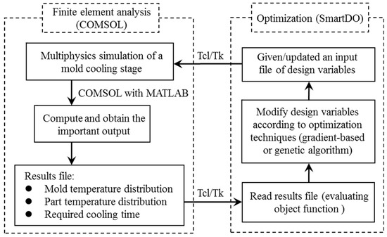 The average mold temperature was 89.5 °C and the average melt temperature was 215.6 °C at the completion of the Moldex3D simulation of the filling and packing stages. These temperatures were input into COMSOL Multiphysics (Version 5.2, COMSOL Inc., Burlington, MA, USA) and served as the initial conditions of the cooling stage. According to the default settings in Moldex3D, the suggested channel temperature was 100 °C, and the suggested cooling time was 18.6 s. However, the cooling time in the COMSOL software was set as 20 s, and neither the runner nor the mold base was included in the simulation. The simulation only focused on the heat transfer between the cooling channel and lens. The cooling channel was assumed to have a turbulent flow. By using the Reynolds number formula, the volumetric flow rate of the conventional cooling channel with a diameter of 10 mm was derived as 28.81 cm3/sec and that of the planar conformal cooling channel with a diameter of 4 mm was derived as 11.53 cm3/sec. Moreover, COMSOL was adopted to couple the non-isothermal pipe flow interface with the heat transfer in solids interface [23] for simulating the temperature distribution of the melt in the mold cavity during the cooling process. The solidification of the polymer melt flow near the cold cavity wall was not considered. Furthermore, two approaches in SmartDO (FEA-Opt Technology Inc., Miaoli County; Taiwan), namely the gradient-based algorithm (GBA) [24] and robust genetic algorithm (RGA) [25,26], were separately integrated with COMSOL to optimally design the layout of the conformal cooling channels. The conventional cooling channels were not involved in optimization. The integration framework is displayed in Figure 7. The script loop is available in the online supplementary data. The pros and cons of the two optimization algorithms were compared according to the temperature distributions on the lens surfaces.