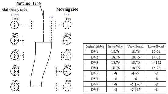 Lower and upper bounds on the design variables (DVs) according to the distances suggested in Figure 4 between the cooling channel and mold cavity surface, where the initial value represents the geometric layout of the planar conformal cooling channels.