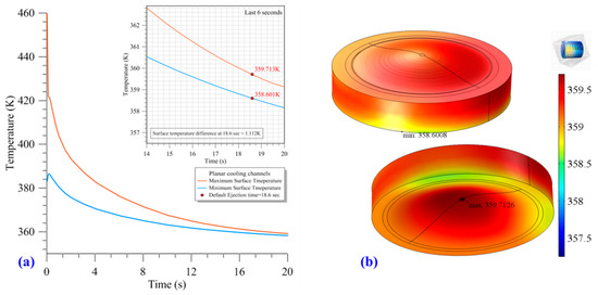 (a) Surface temperature of the melt during the cooling stage and (b) surface temperature of the melt at the default ejection time of 18.6 s when using the planar conformal cooling channels.