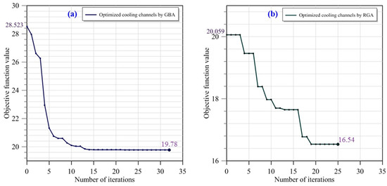 The GBA and RGA algorithms of the SmartDO software were employed for evenly reducing the surface temperature of the melt in the mold cavity. The objective function of the two algorithms converged to a minimum value in the optimization procedure (Figure 10). The objective function value of the GBA was 19.78, whereas that of the RGA was 16.54. The optimized design parameters obtained using these two algorithms are displayed in Figure 11. By using these design parameters (Table 2), two conformal cooling channels with different geometric layouts could be created and imported into COMSOL to simulate the cooling process. The cooling efficiency and improvement in the lens temperature distribution were compared between the GBA- and RGA-optimized channels.