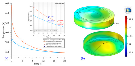 The conformal cooling channels designed using the GBA were used to simulate the cooling process. The results indicated the variations in the maximum and minimum surface temperature of the melt in the mold cavity, as displayed in Figure 12a. For the planar conformal cooling channel, the default maximum surface temperature for the ejected lens was set as 359.713 K. For a temperature of 359.713 K, the ejection time for the GBA-optimized conformal cooling channels was 16.9 s. However, according to the cooling time suggested by Moldex3D, the lens was ejected at 18.6 s. The temperature distribution for the surface of the lens at 18.6 s is displayed in Figure 12b, with a maximum temperature of 358.906 K, a minimum temperature of 358.173 K, and a temperature difference of 0.733 K. Moreover, the ejection time for the RGA-optimized conformal cooling channels was 14.55 s (Figure 13a). The temperature distribution on the lens surface at 18.6 s for the RGA-optimized channels is displayed in Figure 13b, with a maximum temperature of 357.861 K, a minimum temperature of 357.255 K, and a temperature difference of 0.606 K. Thus, after the planar conformal cooling channels were modified, the GBA- and RGA-optimized three-dimensional conformal cooling channels enhanced the cooling efficiency and improved the temperature distribution of the melt in the mold cavity.