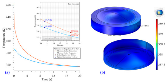 (a) Surface temperature of the melt during the cooling stage and (b) surface temperature of the melt at the default ejection time of 18.6 s when using the RGA-optimized cooling channels.