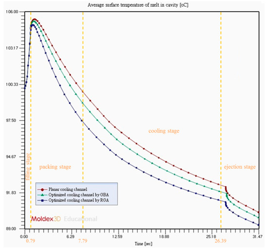 Average surface temperature of the melt in cavity during the complete injection molding cycle with different conformal cooling channels.
