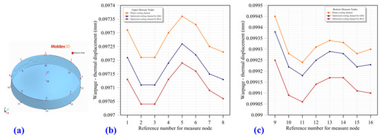 The conformal cooling channels designed using the GBA and RGA optimization algorithms were imported into Rhinoceros 3D software, which was used to construct the solid mesh models. The models were then used to execute the entire injection molding simulation with the Moldex3D software. The computation time was approximately 45 min when using two 2.4-GHz Intel Xeon E5-2620 CPUs with 64 GB of RAM. The results indicated that the optimized conformal cooling channels exhibited a lower average surface temperature for the melt compared with that exhibited by the planar conformal cooling channels (Figure 14). At the end of cooling, the surface temperatures simulated using Moldex3D were consistent with those simulated using COMSOL (Figure 9b, Figure 12b, and Figure 13b). If the temperature on the lens surface could be evenly distributed, the thermal-displacement-induced warpage could be improved. Therefore, to evaluate the thermally induced warpage, 18 measured nodes were selected on the lens surface. The locations and numbering of these measured nodes are displayed in Figure 15a. Measured nodes 1–16 were located on the top and bottom edges of the lens and used to calculate the total thermal warpage. The results were used to evaluate the variation in the circularity (roundness) due to the warpage. The average thermal warpage values for the planar conformal cooling channels, GBA-optimized conformal cooling channels, and RGA-optimized conformal cooling channels were 98.296, 98.214, and 98.121 μm, respectively (Figure 15b,c). Thus, the optimized conformal cooling channels exhibited a lower thermal warpage than the planar conformal cooling channels. Moreover, measured nodes 17 and 18 were located at the centers of the top and bottom surfaces of the lens, respectively. These two measured nodes were used to observe the relative thermal warpage in the vertical direction (z-direction). The vertical thermal warpage values for the GBA- and RGA-optimized conformal cooling channels were 21.617 and 21.565 μm, respectively. Both these values were lower than the vertical thermal warpage of the planar conformal cooling channels (21.638 μm).