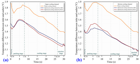 When designing cooling channels, the rules for their geometric layout should be considered and the temperature difference between the inlet and outlet should be minimized to prevent the warpage of the lens due to uneven temperature distribution in the mold. Generally, if the product requires high accuracy, the temperature difference between the inlet and outlet should be lower than 2.5 °C [28]. The simulation results of the GBA- and RGA-optimized cooling channels indicated that the temperature difference between the inlet and outlet of the optimized cooling channels was lower than that of the planar conformal cooling channels regardless of the upper and bottom channels (Figure 16). The GBA- and RGA-optimized conformal cooling channels improved the temperature uniformity of the mold.