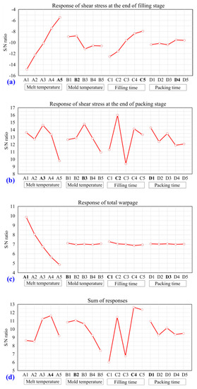 S/N ratios for: (a) shear stress at the end of the filling stage; (b) shear stress at the end of the packing stage; (c) total warpage; and (d) sum of responses from (a) to (c).