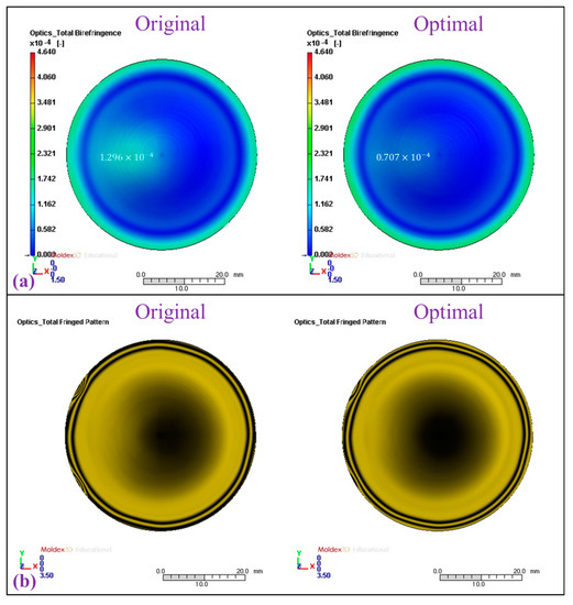 After the geometric optimization, the cooling channel with the highest cooling efficiency for the mold and the most even temperature distribution for the lens surface was adopted. Thus, the RGA-optimized cooling channel layout was selected for the DOE to determine the most suitable molding conditions. The optimal process parameters were selected on the basis of the signal/noise (S/N) ratio response. The optical properties of the lenses were compared before and after performing the DOE. Figure 17 illustrates the calculation results of the S/N ratio response from the DOE module of Moldex3D. The total S/N ratio response was obtained by adding the S/N ratio responses from three quality factors under four control factors and five levels (Figure 17d). A high S/N ratio indicates low noise (external influence). According to the Taguchi method, the level with the maximum S/N ratio was selected as the optimal condition [16,29]. Therefore, the optimal combination of control factors, reported in Table 1, and their corresponding levels was A4B2C4D1. The optimal control factor level settings were A4 (melt temperature: 285 °C), B2 (mold temperature: 89.75 °C), C4 (filling time: 0.99 s), and D1 (packing time: 6 s). This combination of process parameters (A4B2C4D1) was used in the injection molding simulation. The optics module of Moldex3D was adopted to predict the birefringence and fringe pattern of the lens. After the DOE analysis, the birefringence of the lens considerably decreased (Figure 18a), which indicated that the residual stress within the material also diminished [16]. Moreover, after the processing optimization, the fringe pattern on the lens resembled concentric circles (Figure 18b). The distributions of the fringe pattern on the optimized molded lens were rarefied near the gate, which implied that the optical properties of the lens had been improved.