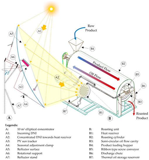 In a nutshell, there is a strong need of devising self-sufficient, economically viable, and environment friendly off-grid solutions for medium to high range temperature agricultural processing particularly in remote areas of tropical regions, i.e., solar power. Tropical regions receive daily normal irradiance (DNI) between 5.5–7.5 kWh/m2 with more than 300 sunny days per year [14]. This massive solar potential can be utilized to meet the above stated challenging and need based assignment in a decentralized manner. Roasting of perishables using concentrating solar power is a novel and promising field. A variety of solar collectors are available to concentrate the incoming DNI to produce medium to high temperature range heat energy which can be employed in the subsequent process by coupling suitable technologies [15]. The promotion of innovative solar based technologies for switching the agricultural processing from non-renewable to renewable energy resources can not only upsurge the on-farm value-addition facilities but also contribute towards a sustainable environment and rural development.